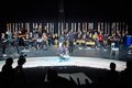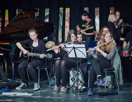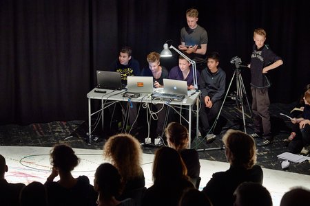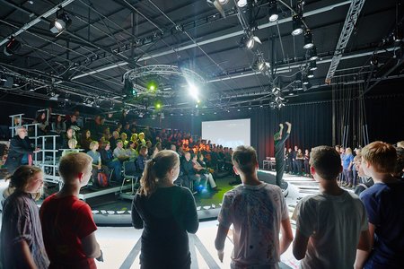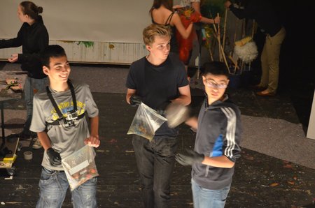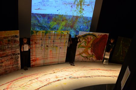 „Auf einer Drehbühne können die Zuschauer mitverfolgen, wie die Jugendlichen in diesem Jahr gearbeitet haben. Das Bühnenbild bewegt sich, es führt durch die verschiedenen Disziplinen und veranschaulicht den künstlerischen Prozess. Es gibt viel zu sehen: Ein Orchester spielt, probt und begleitet, die Jugendlichen tragen Lyrik und Prosa vor. Auch die Kunst, die sonst in Ateliers versteckt bleibt, bringen sie auf die Bühne. Die Schüler bemalen Leinwände oder kreieren Kunstwerke mit Hilfe von Farbbeuteln“